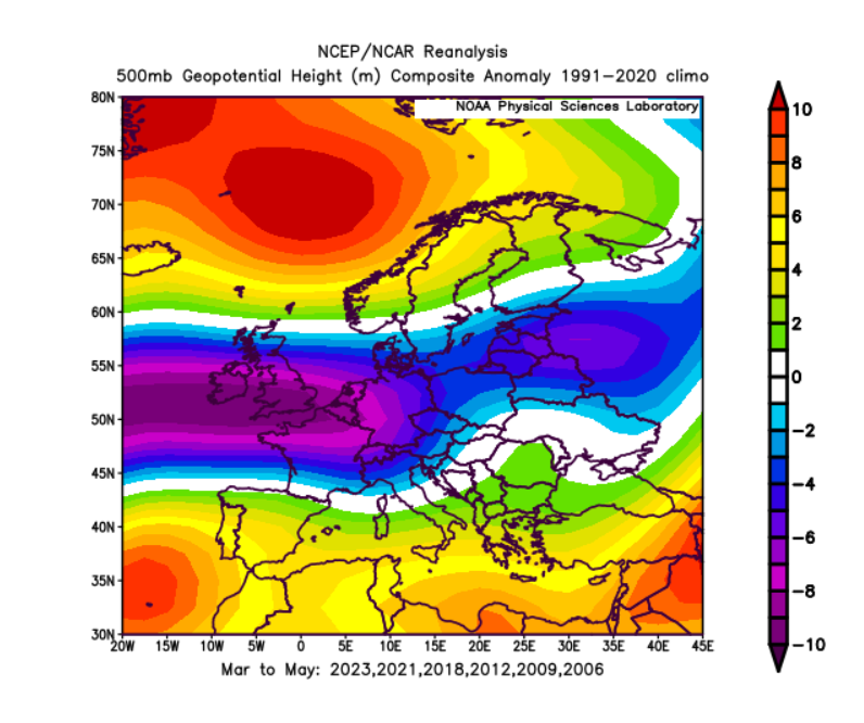 Kompozit anomalij geopotencialnih višin na 500 hPa za pomlad v analognih letih kaže močan pozitiven center nad Skandinavijo in Sredozemljem ter globok negativen center, ki se razteza od Britanskega otočja čez Srednjo Evropo in Alpe vse do baltiških držav. Ta dipolni vzorec ustvarja izrazit meridionalni tok, ki prinaša veliko spremenljivosti vremena. V Sloveniji lahko zato pričakujemo dinamično pomlad z izmenjavo toplih in vlažnih zračnih mas z juga ter občasnih hladnejših vdorov z vzhoda ali severa. Temperature bodo v povprečju rahlo nad normalo, padavine nekoliko povečane, vreme pa zelo nestabilno z hitrimi prehodi med sončnimi in deževnimi obdobji.