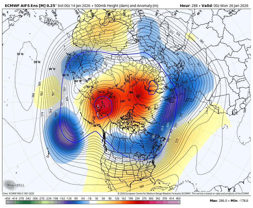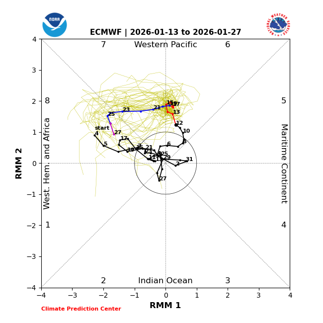 Madden–Julianova oscilacija (MJO) prehaja v fazo 6 in nato v fazo 7 (nad zahodnim Tihem oceanom). Ta premik krepi subtropske vetrove (izbruhe pacifiškega curka), kar preko valovnega prenosa v troposferi poveča amplitudo valov, ki se prožijo navzgor v stratosfero, ter spodbuja nastanek blokad nad Skandinavijo. Trenutne prognostične karte kažejo, da bo ta pacifiški vetrovni izbruh vztrajal vsaj do konca januarja — to zmanjšuje verjetnost za vzpostavitev +NAO in povečuje možnost za -NAO (blokirajoč vzorec).
