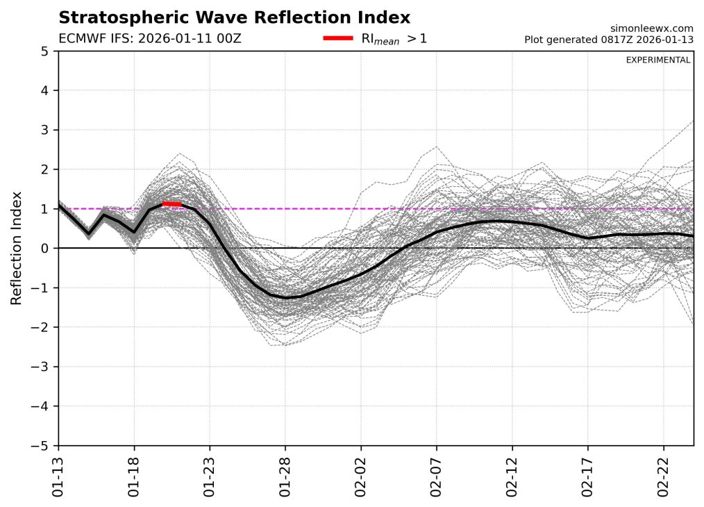 Se še spomnite članka o odbojih, ki sem ga razložil na zelo enostaven način v začetku decembra. Spodnji graf kaže, kako se planetarni valovi v stratosferi obnašajo v naslednjih tednih – ali se odbijajo nazaj proti površju ali pa se v stratosferi kar vpijejo. Med približno 22. januarjem in 5. februarjem se krivulja spusti v negativne vrednosti, kar pomeni, da se planetarni valovi v stratosferi ne bodo več močno odbijali nazaj proti površju, ampak se bodo v glavnem kar vpijali v višje plasti. To je pomemben signal za nas spodaj, ker ko se refleksija valov zmanjša ali izgine, stratosfera preneha tako močno “potiskati” spremembe v troposfero. Posledica je običajno bolj vztrajen vremenski vzorec: jet stream se lahko bolj zvije, blokade nad Evropo ali Skandinavijo postanejo dolgotrajnejše in hladni zrak iz vzhoda ali severa lažje pride do nas brez velikih motenj od zgoraj.