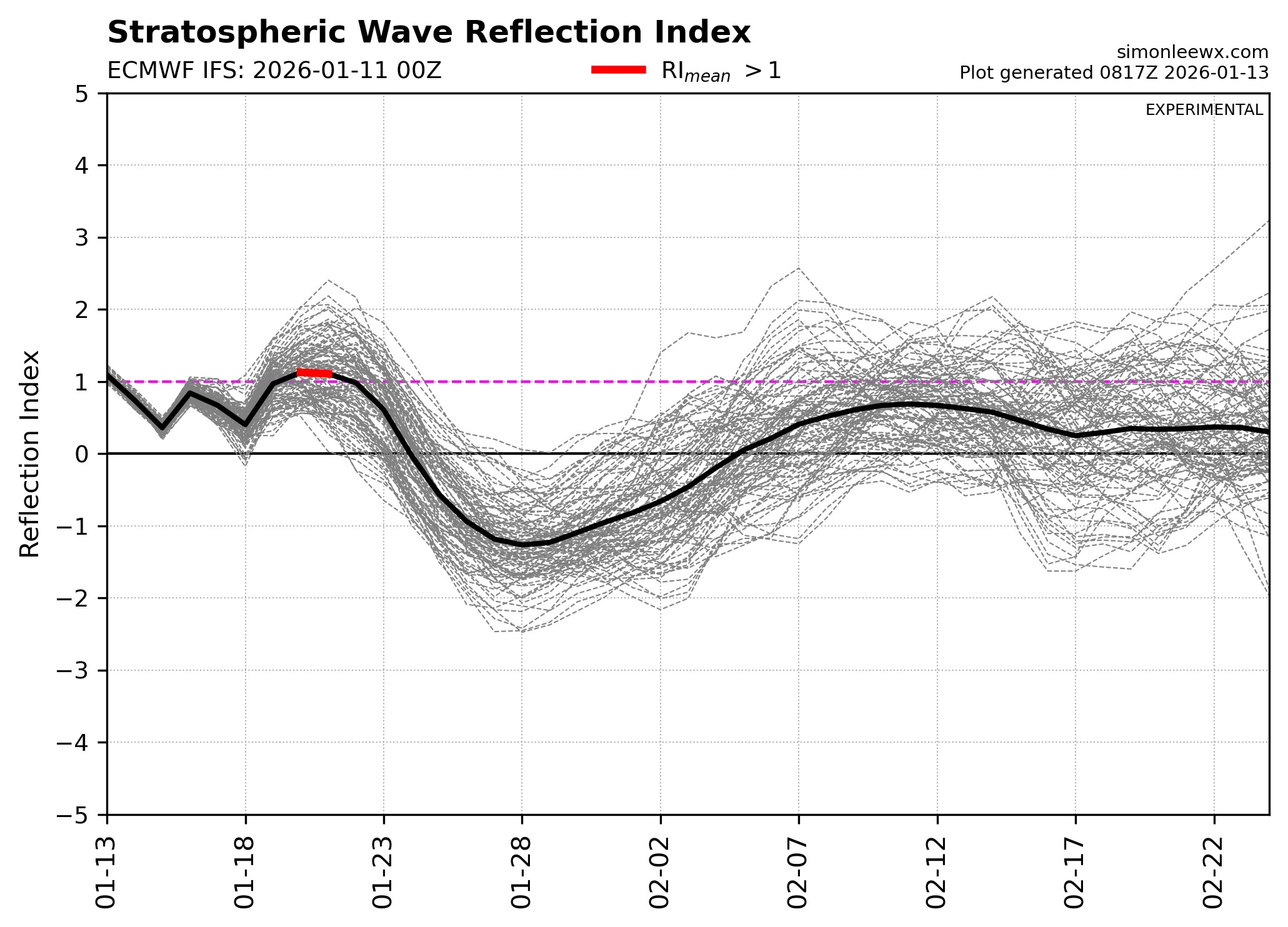 Ta graf prikazuje Stratospheric Wave Reflection Index, eksperimentalni indeks, ki ga razvil Simon H. Lee (Univerza St Andrews) za zaznavanje dogodkov refleksije stratosferskih valov navzdol iz stratosfere v troposfero.