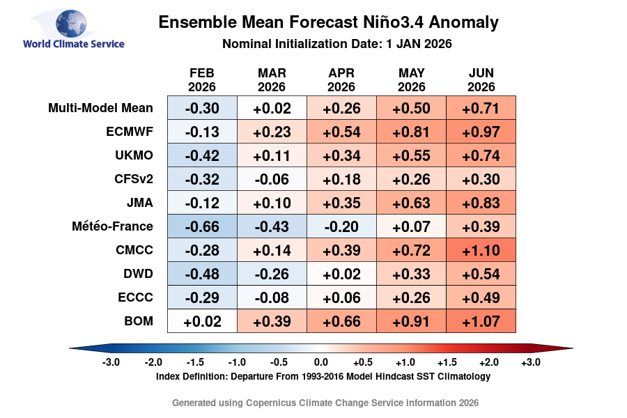 Napovedi različnih podnebnih modelov za mesece od februarja do junija 2026, anomalij temperature morske površine (SST) za regijo Niño3.4