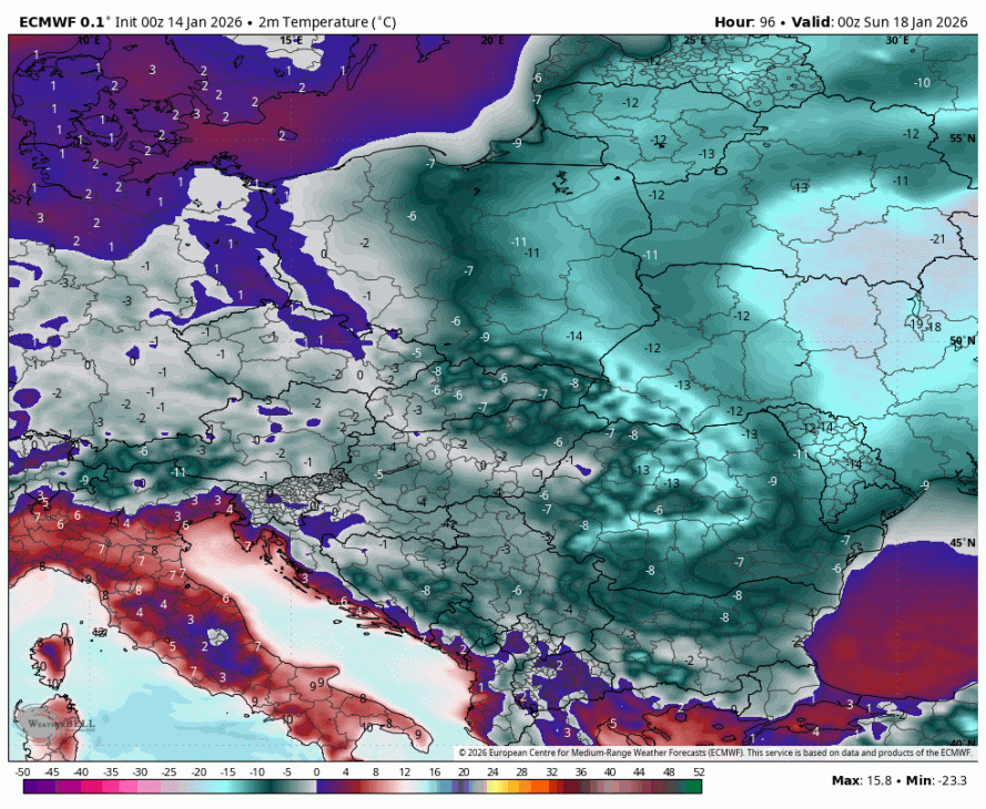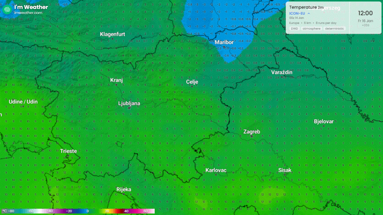 Ob koncu tedna lahko pričakujemo širjenje obsežnega anticiklona, ki se bo iz zahodne Rusije razširil nad območje Alp. V sinoptičnem pogledu bo ta anticiklon vzpostavil stabilno visokotlačno območje z močnejšo subsidenco in zmanjšano oblačnostjo po zalednih legah ter spremenil smer in strukturo advekcije zraka. Z vzhodne smeri bo v nižjih plasteh atmosfere začel pritekati mrzel polarni zrak; zaradi šibke vertikalne mešanosti, značilne za visok tlak, se bo hladen zrak v dolinskih in nizko ležečih predelih poglabljal in lahko povzročil jutranje temperaturne inverzije. V praksi to pomeni izrazito ohladitev v nočnem in jutranjem obdobju v odprtih in zavetrnih legah ter pojav nizke oblačnosti ali megle v kotlinah in ob rekah, kjer se bo zrak kondenziral. Na višjih nadmorskih višinah in izpostavljenih legah bo prevladovalo suho in jasno vreme ter nekoliko toplejše, verjetnost za padavine pa je zelo majhna.