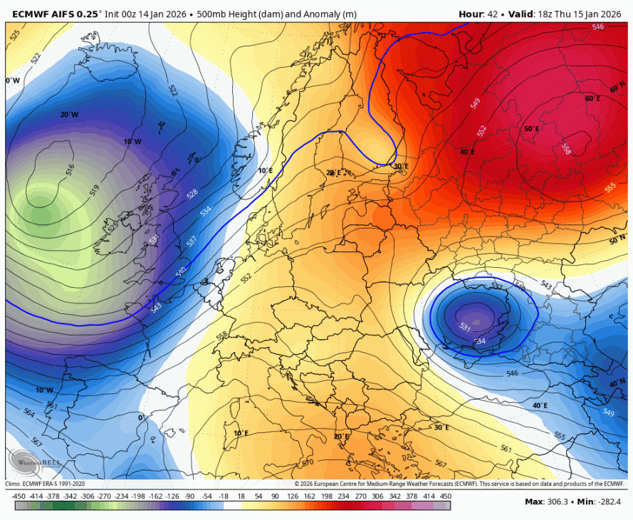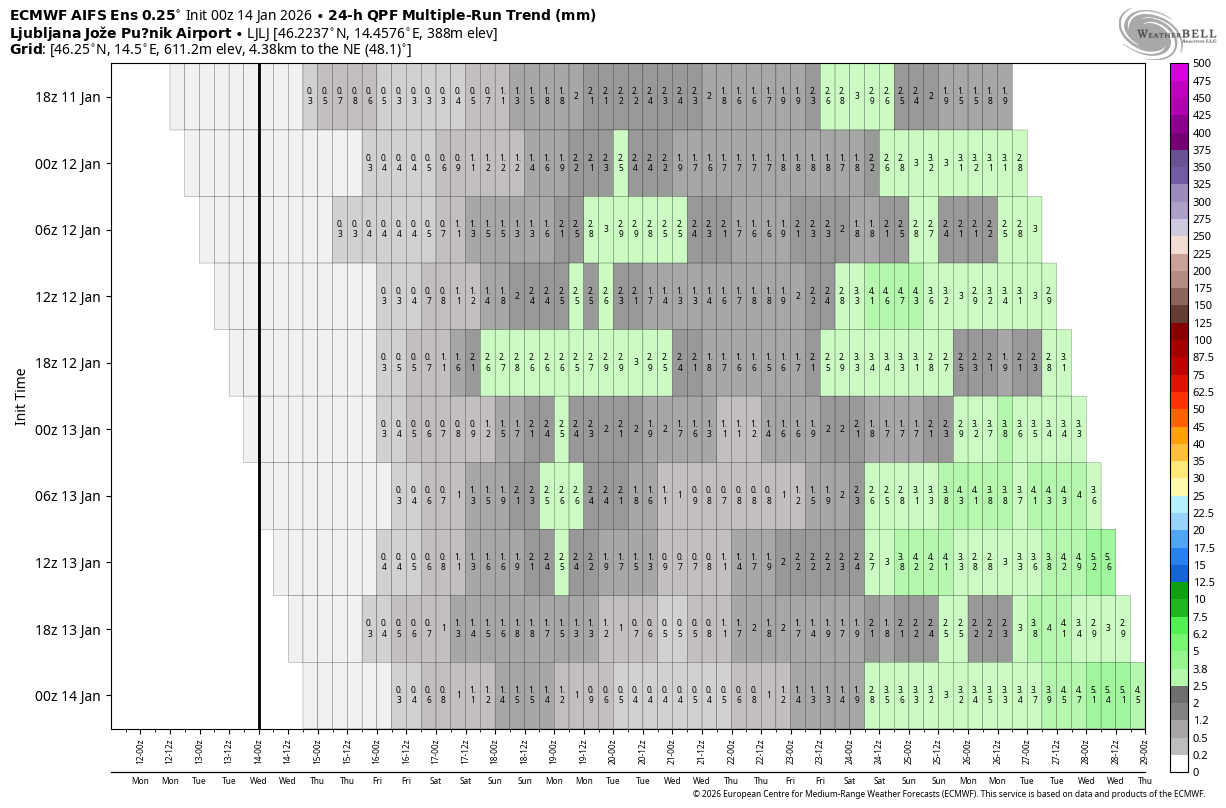 Na začetku obdobja sinoptična situacija spominja na februar 2012, ki velja za enega izmed analognih let ob prehodu razmer La Niña v nevtralno fazo; takšna analogija nakazuje možnost podobnih atmosferskih vzorcev. Verjetnost padavin se poveča proti koncu naslednjega tedna(kot tudi kaže ens AIFS zgoraj), ko sinoptične karte kažejo oslabitev anticiklona nad Srednjo Evropo in njegov pomik proti arktičnemu krogu. Tak premik odpira pot za vdor hladnejšega celinskega zraka s severovzhoda, hkrati pa omogoča tudi bolj prožno prodiranje atlantskih motenj v smeri Sredozemlja. Interakcija med nasprotujočima si zračnima masama – mrzlim kontinentalnim zrakom z vzhoda in vlažnimi atlantskimi ali sredozemskimi sistemi – lahko v določenih konfiguracijah privede do intenzivnejših padavinskih epizod. V preteklosti so podobne sinoptične postavitve v Sloveniji sprožile tudi obsežnejše snežne pošiljke; končni izid bo tokrat v veliki meri odvisen od položaja in moči sredozemskega ciklona ter hitrosti in razvoja interakcije med ciklonom in vdorom polarnega zraka.
