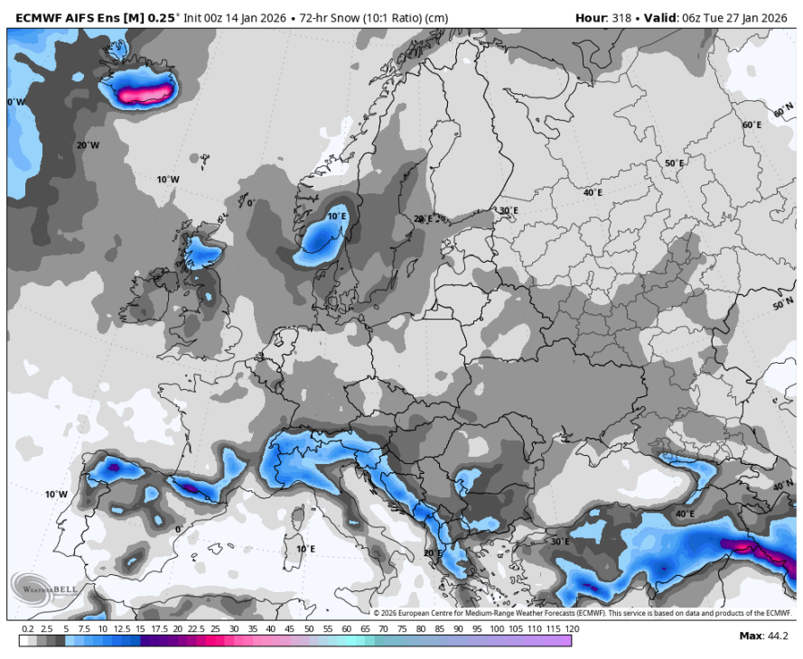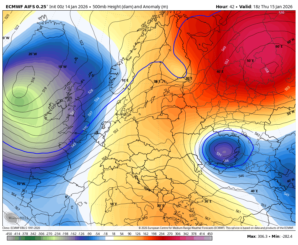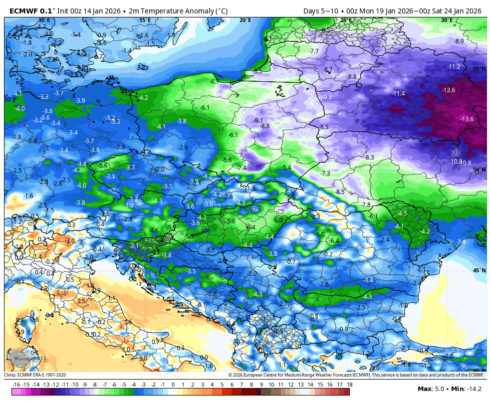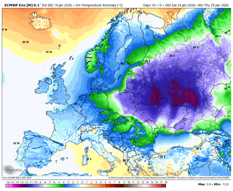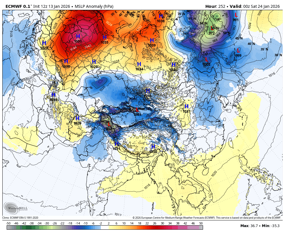 Med približno 16. in 21. januarjem se AAM pričakovano rahlo dvigne nazaj proti ničli, kar lahko prinese kratek prehod v nekoliko stabilnejše ali milejše vreme, saj se zahodni tokovi začasno okrepijo. Zakaj tako, če ste brali objavo prejšnjo sredo o gorskem navoru veste zakaj. Stanje s snežno odejo nad Sibirijo je precej boljše kot v decembru. Snežna odeja krepi sibirski anticiklon nad ogromnim območjem Sibirije, Mongolije in severne Kitajske se gradi eden najmočnejših takih anticiklonov, kar smo jih videli v zadnjih letih. Ta gigantski visok pritisk deluje kot nekakšen atmosferski motor, ki ustvarja močne vzhodne vetrove na površju in v nižjih plasteh atmosfere, ti vetrovi pa prenašajo pozitivni kotni moment in tako začasno dvigujejo globalni atmosferski kotni moment (AAM) nazaj proti nevtralnemu območju. Prav zato se bo AAM v naslednjih dneh, nekje med 16. in 21. januarjem, rahlo okrepil in dosegel približno ničlo, kar lahko prinese kratek prehod v nekoliko stabilnejše ali celo malce milejše vreme v Evropi. Vendar ta isti sibirski anticiklon hkrati deluje kot velikanski rezervoar hladnega zraka, ki ga počasi potiska proti zahodu, proti Srednji Aziji in potencialno tudi proti nam v Evropo. Ko se ta hladni zrak združi z oslabljenim polarnim vrtincem in morebitnimi blokadami nad Skandinavijo ali Atlantikom, se po tem kratkem “oddihu” odpre pot za daljše obdobje hladnejšega, bolj celinskega vremena, ki bi lahko v drugi polovici januarja in tudi v februarju prineslo tudi v Evropo, snežne padavine in tisti pravi zimski občutek, ki smo ga v zadnjih letih pogosto pogrešali.
