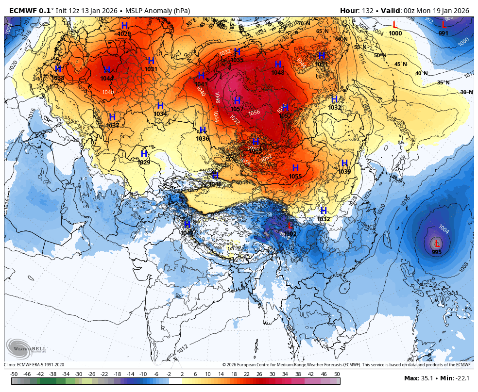 Nad ogromnim območjem Sibirije, Mongolije in severne Kitajske se gradi sibirski anticiklon, kar dviguje AAM