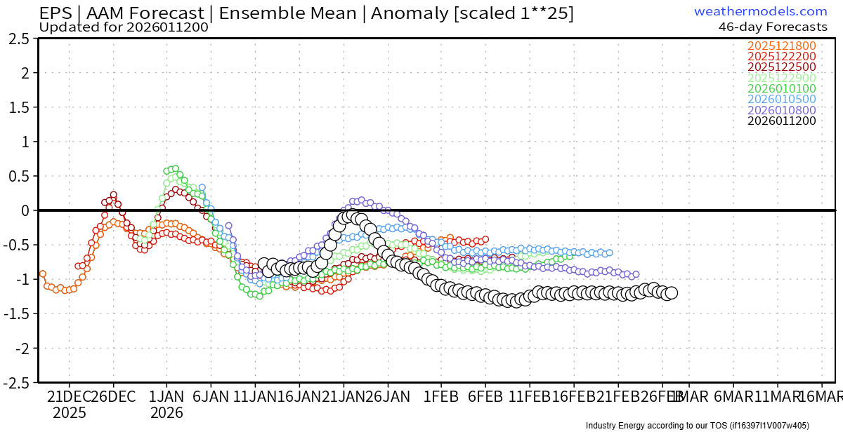 Poglejmo stanje v atmosferi, trenutna napoved atmosferskega kotnega momenta (AAM) kaže, da smo zdaj v negativni fazi – globalni zahodni vetrovi so oslabljeni, kar podpira bolj blokirane in valovite vremenske vzorce.