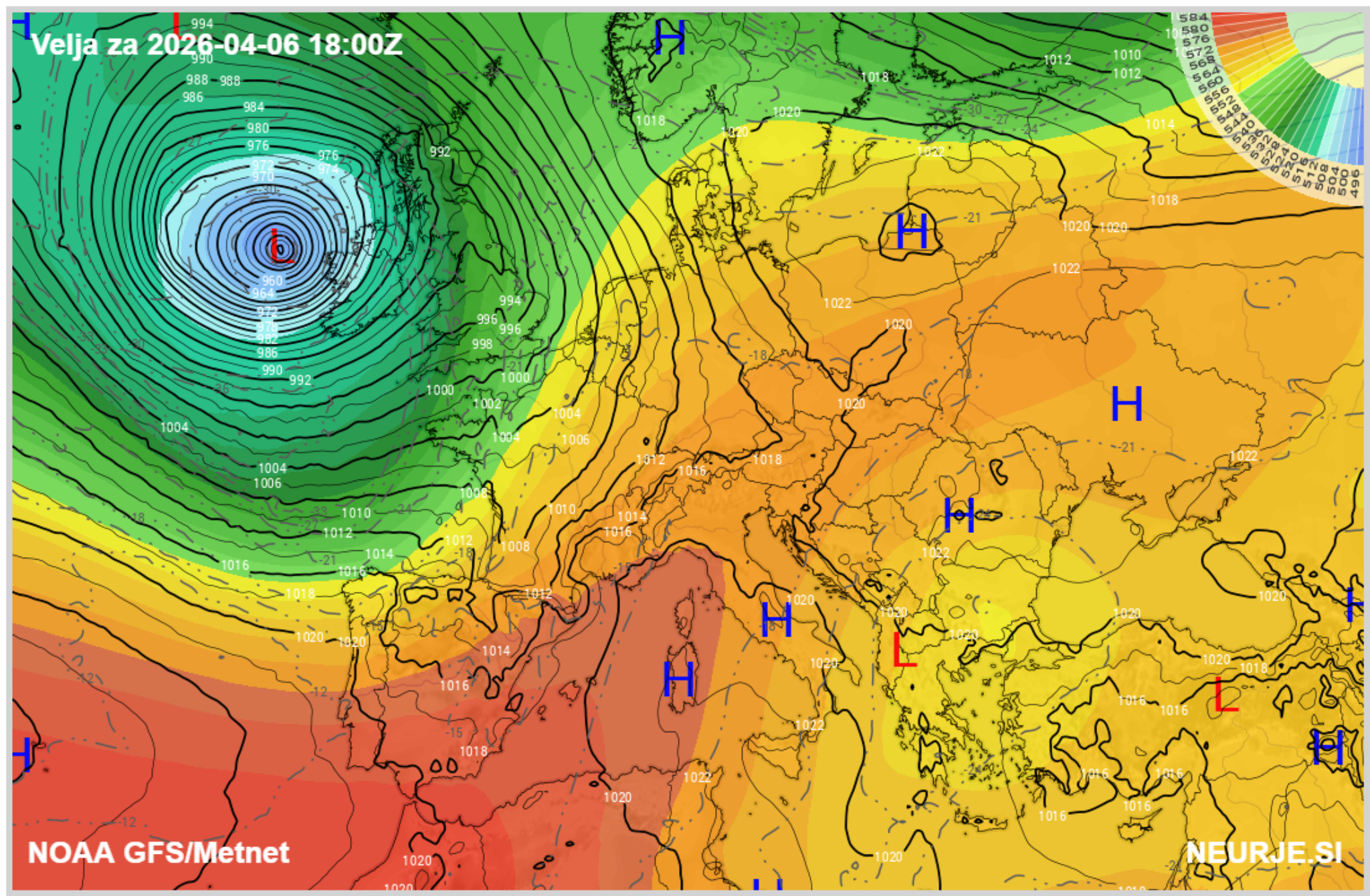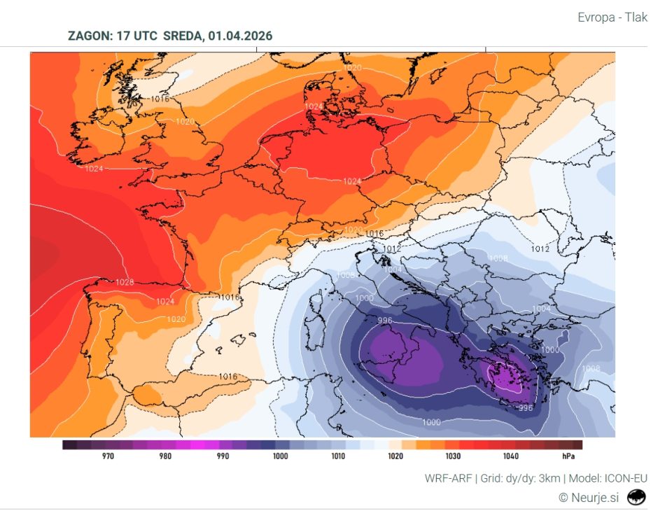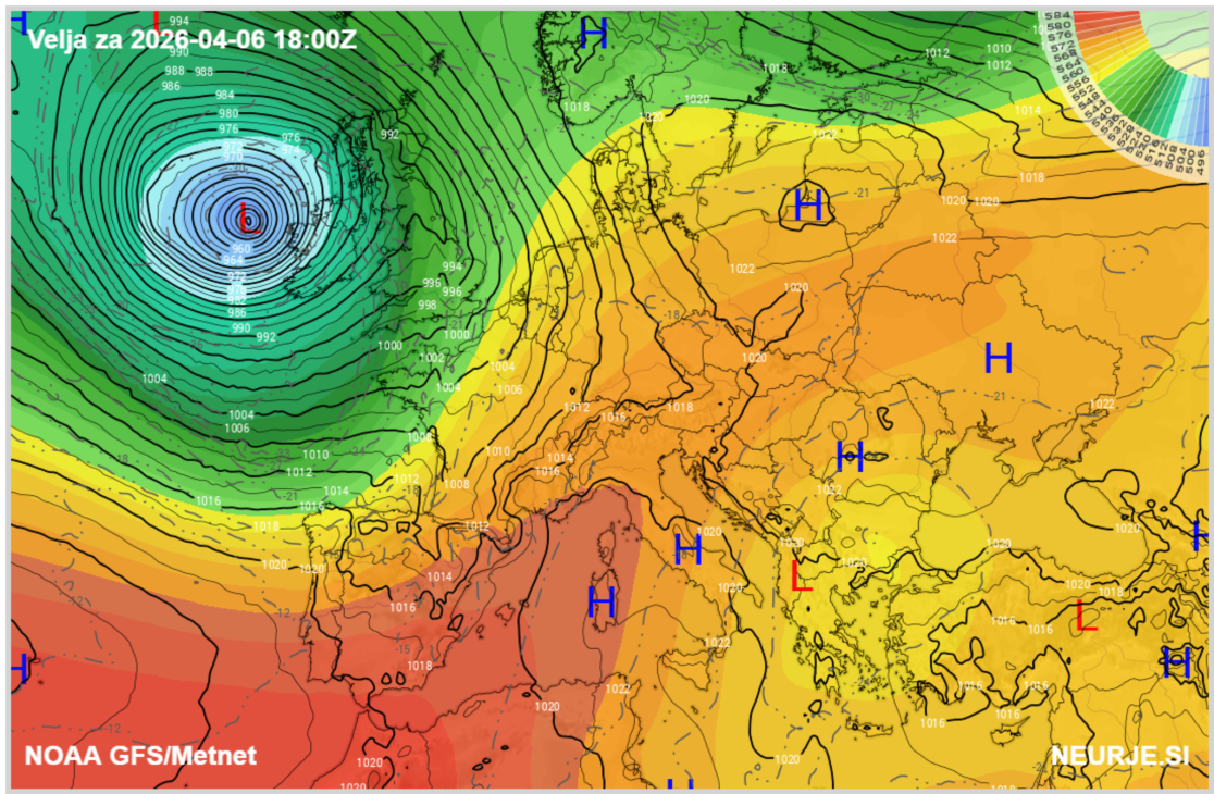 Na širši evropski sliki se bo vzpostavil izrazit kontrast. Zahod Evrope bo pod vplivom globokega ciklona z vetrovnim in deževnim vremenom, medtem ko bo nad srednjo in vzhodno Evropo sprva še prevladovalo območje visokega tlaka in toplega zraka. Prav ta razlika bo omogočila dotok zelo toplega zraka proti Alpam in Balkanu, nato pa tudi postopno širjenje bolj nestabilnega vremena proti našim krajem.