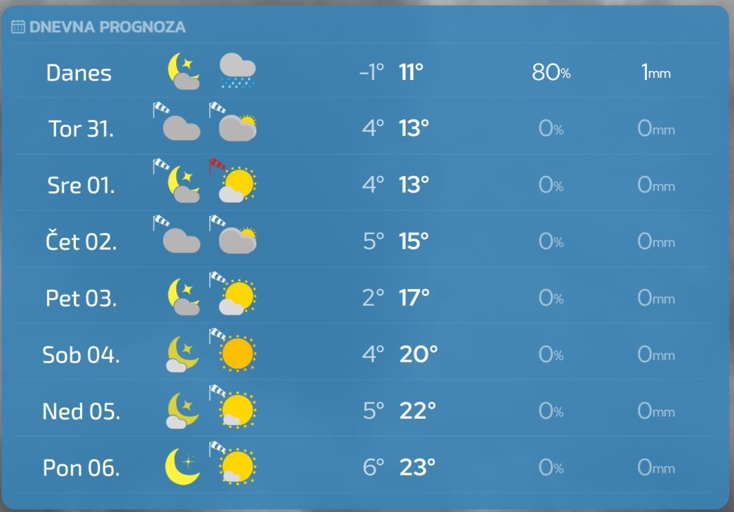 Če strnemo: do okoli 6. ali 7. aprila nas čaka stabilno, sončno in nadpovprečno toplo pomladno vreme, nato pa prehod v bolj spremenljivo fazo z več padavinami in nekoliko manj zanesljivo temperaturno sliko.