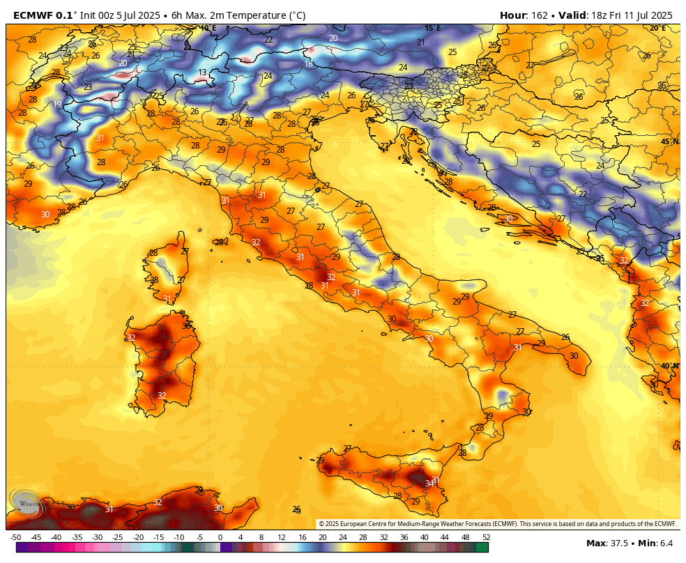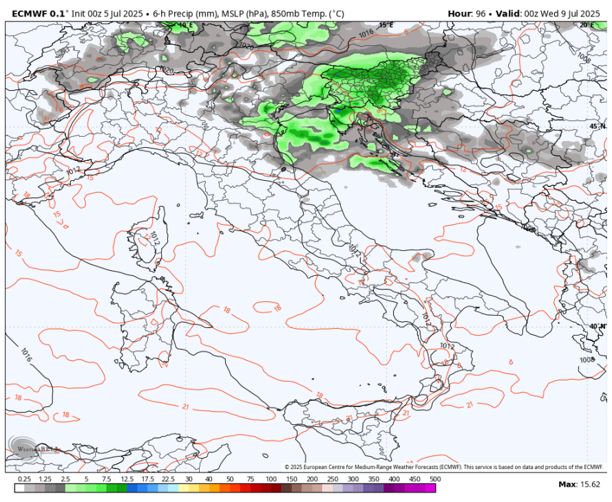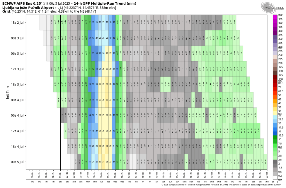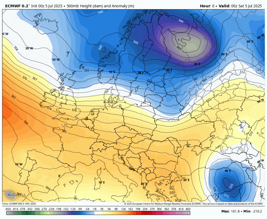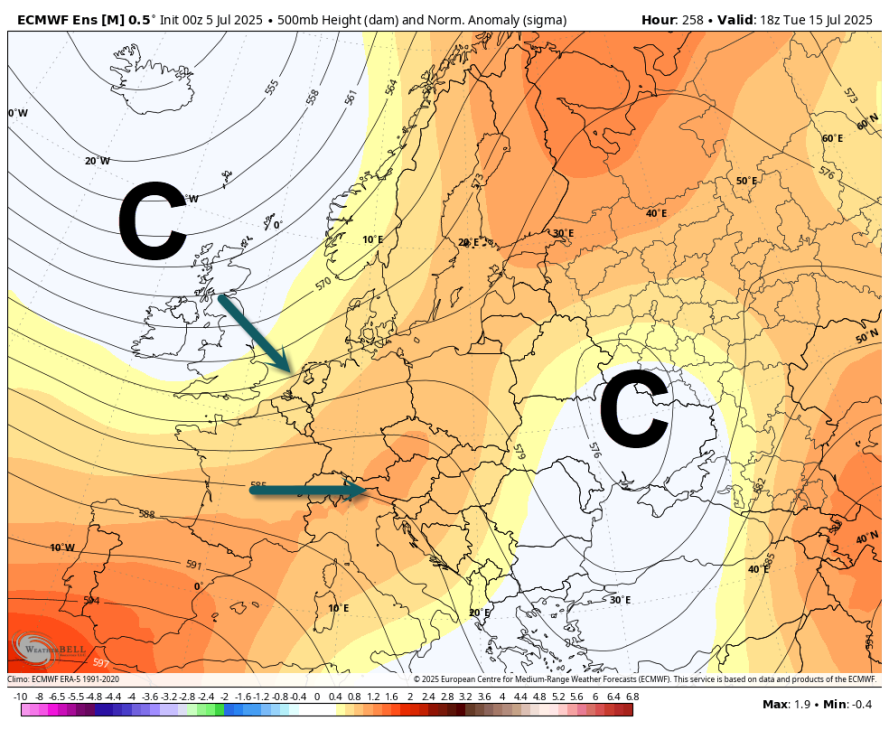 Z višinskim obratom v zahodno smer se okoli 15.julija poveča možnost za padavine. Zaenkrat pa kaže da bo prevladovalo sončno in vroče vreme, te padavine so zaenkrat bolj v obliki popoldanskih krajevnih ploh in neviht, seveda pa je predaleč za resno napoved.