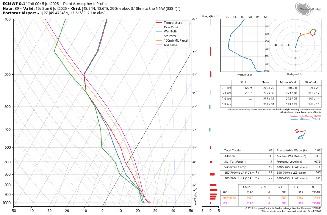Na tem vertikalnem profilu atmosfere vidimo precej dejavnikov, ki so potencialno nevarni za razvoj burnega vremenskega dogajanja. Prvi pomemben dejavnik je nestabilnost ozračja, ki jo merimo s CAPE(Convective Available Potential Energy) – vrednosti nad 1500–2000 J/kg kažejo na veliko energijo za razvoj neviht. Vrednosti 2180 J/kg kaže na močno nestabilno ozračje, kar je ugodno za razvoj močnejših neviht. Supercell Composition (Comp.) 2.9 kaže na možnost razvoja superceličnih neviht. Vertikalno striženje vetra (wind shear) mora biti dovolj močno; razlika v hitrosti/smeri vetra med tlemi in 6 km, večja od 20–25 m/s, povečuje možnost organiziranih neviht ali supercelic. Hodograf za Portorož nakazuje zmerno striženje vetra z opaznimi spremembami smeri in hitrosti z višino, kar je značilno za organizirane nevihte. Pomembna je tudi vrtinčnost (helicity) nad 150 m²/s², kar kaže na potencial rotacije v nevihtah. V tem primeru vrednost znaša približno 129.9 m²/s² za plast od 0 do 1 km, kar je nekoliko pod mejo 150 m²/s², ki običajno nakazuje na večji potencial rotacije v nevihtah. PWAT vrednost 1.82 (46mm) ima tropske karakteristike in kaže na visoko raven vlage v atmosferi, kar lahko privede do obilnih padavin.