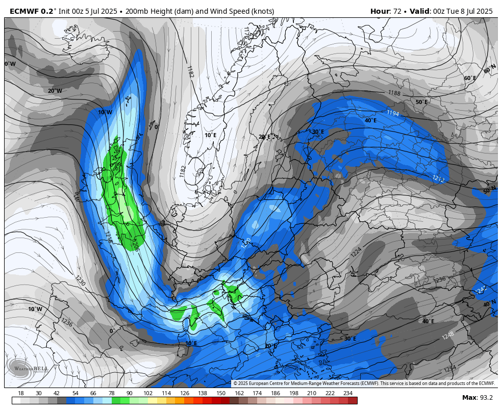 Glavnina dogajanja nad Evropo bo v ponedeljek in torek nad našim območjem, tole nam lepo pokaže karta na višini 200mb, ki prikazuje hitrost vetra v vozlih nad Evropo.