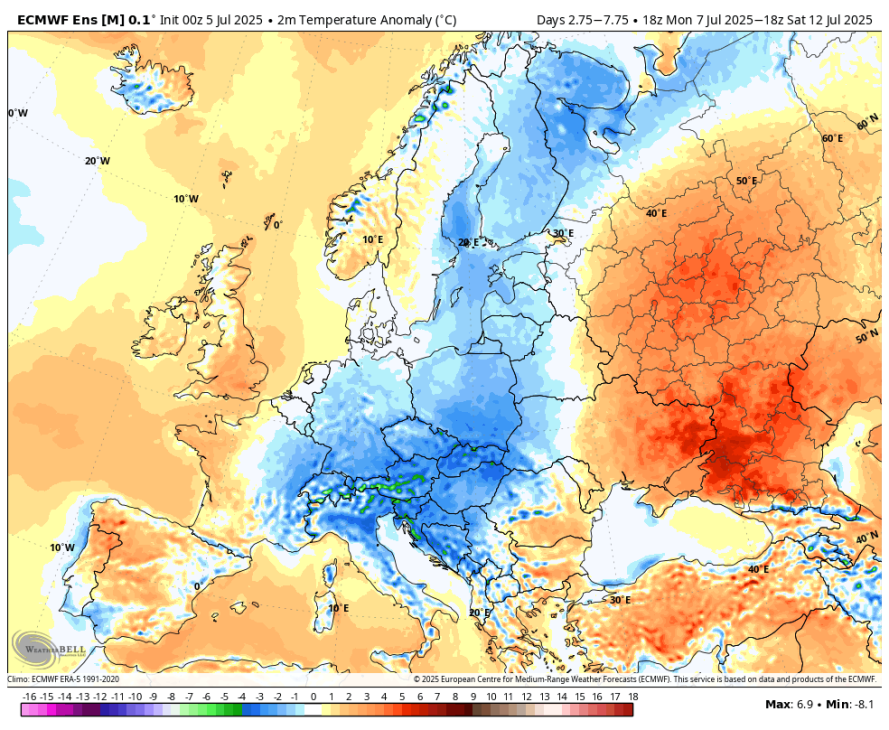 Nato se bo dogajanje umirilo, temperatura pa bo šla spet počasi navzgor, vendar počasneje kot je kazalo ob zadnjem zapisu. Testiram skupinski izračun AI in navadnega ecmwf in se je zaenkrat za dogajanje med 6-11 dni AI pokazal za natančnejšega. Še včeraj je ec kazal središče anticiklona ob koncu naslednjega tedna nad Nemčijo, danes pa precej zahodneje in severneje, zato kakšne vročine tja do nedelje ni pričakovati.