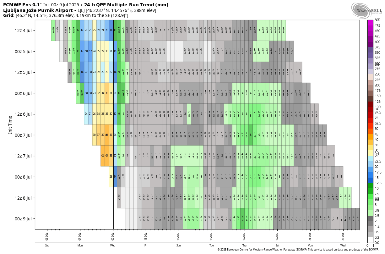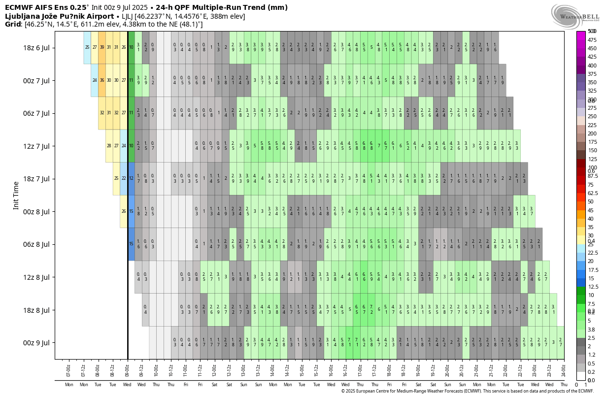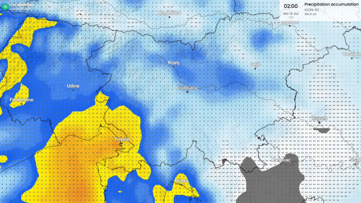 Tudi v naslednjem tednu bomo ob oslabitvi obeh višinskih jeder in krepitve anticiklona nad območjem Alp imeli več sončnega vremena, vendar bomo še naprej v živahnem zahodnem toku. Po skupinskem izračunu AIFS in ECMWF vidimo padavinski dogodek v sredo ali četrtek 17.julija.