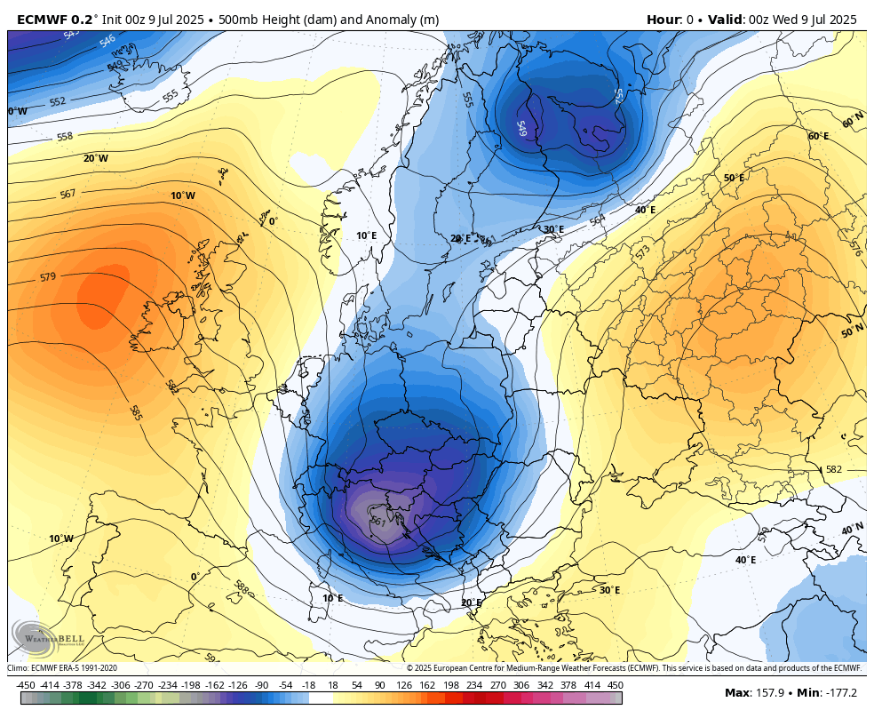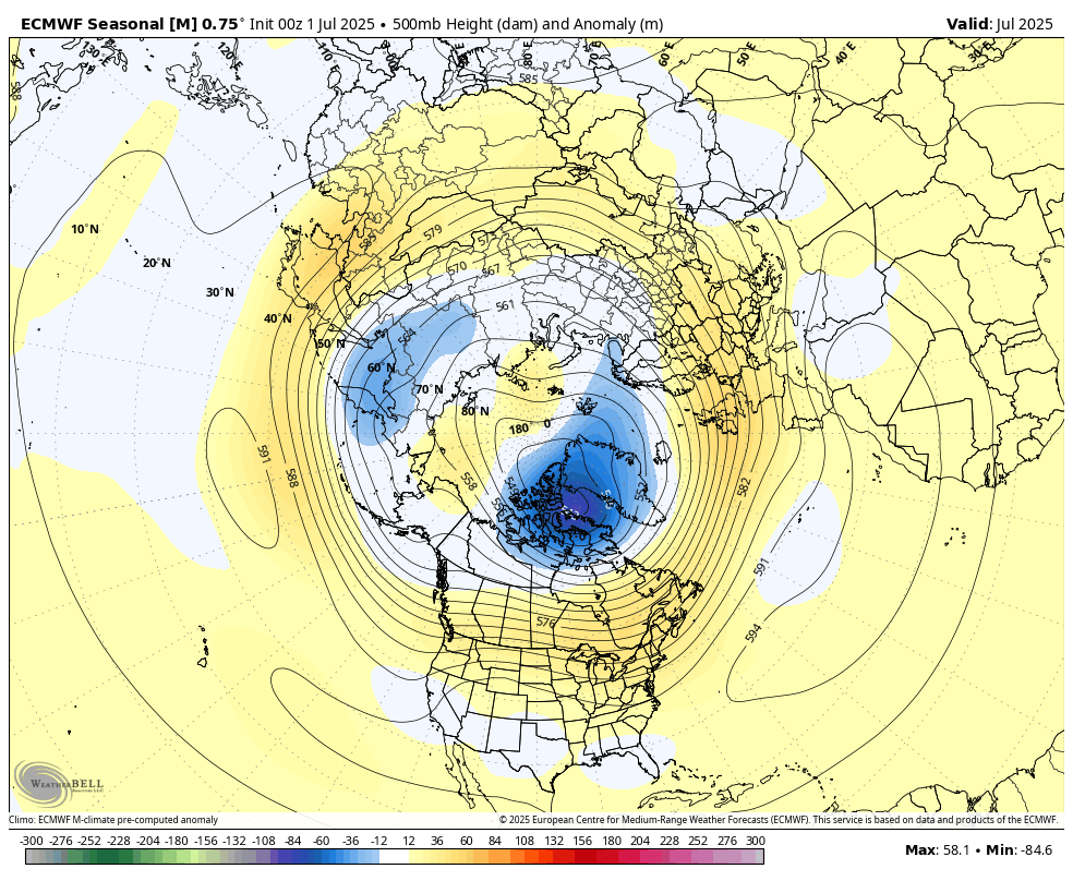 Zemljevid prikazuje višino 500mb (v dekametrih) in anomalijo (v metrih) za julij 2025(vir weatherbell)