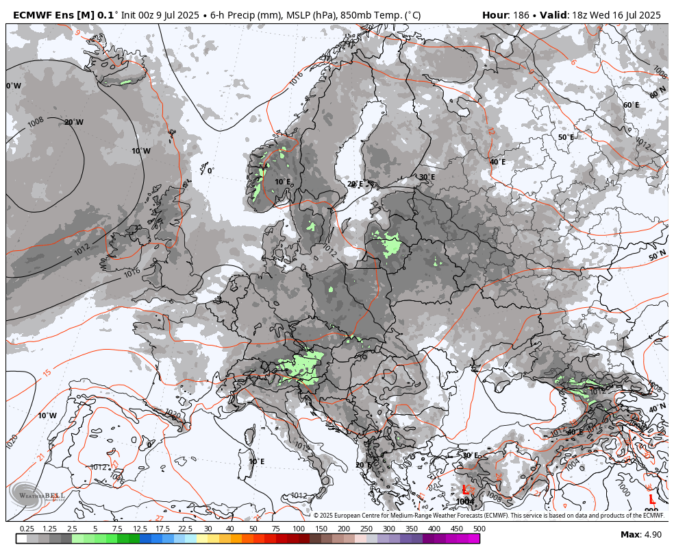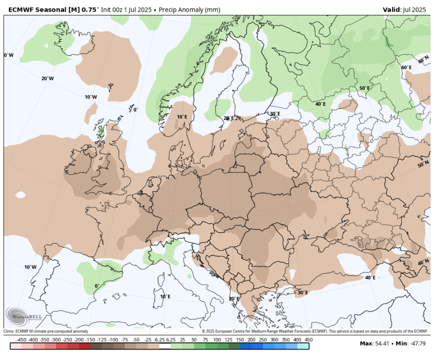 Še ena od napačnih napovedi evropskega sezonskega modela o suhem juliju nad Srednjo Evropo
