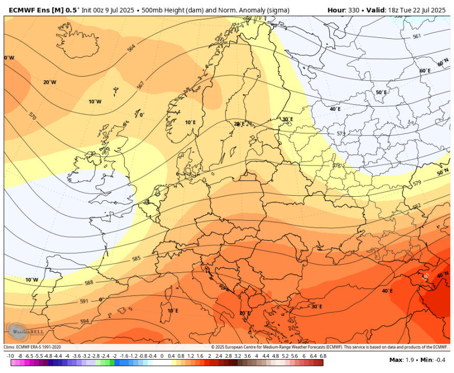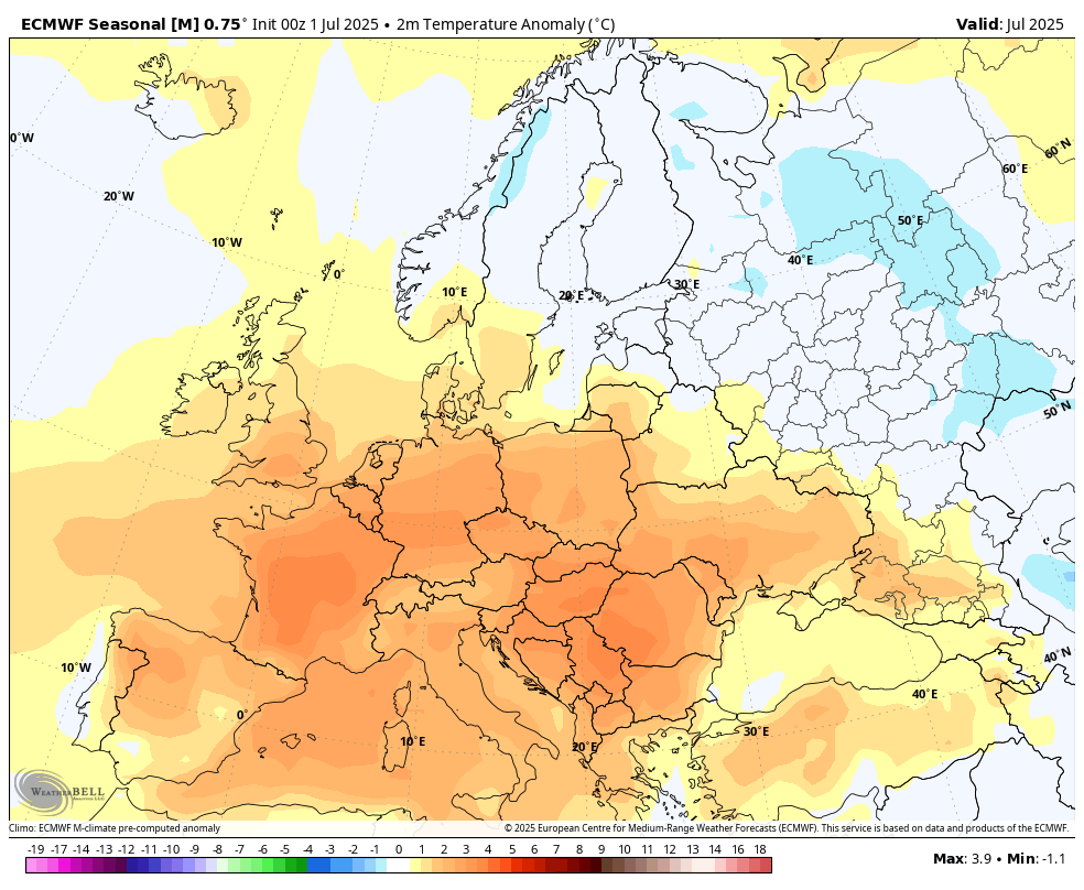 Nova sezonska napoved za mesec julij prinaša nadpovprečno toplo in suho vreme za večji del Evrope. Negativne anomalije geopotencialnih višin so prisotne nad skrajnim robom nad Severno Evropo, nad ostalim delom pa so prisotne večinoma pozitivne anomalije.